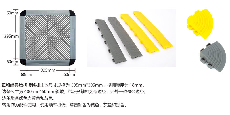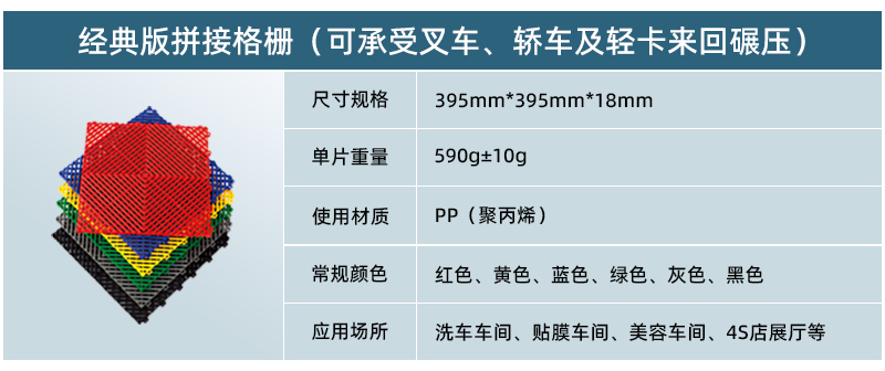 一套完整的拼接格柵產(chǎn)品由主體格柵、公邊條、母邊條、轉(zhuǎn)角四部分構(gòu)成,主體格柵的尺寸為395mm*395mm*18mm,厚度為18mm,邊條尺寸為400mm*60mm*8mm,轉(zhuǎn)角為扇形結(jié)構(gòu),尺寸規(guī)格為60mm*60mm*18mm。 拼接格柵通過(guò)一個(gè)簡(jiǎn)便互鎖接口設(shè)計(jì),重量輕,可拆卸,易于安裝。無(wú)需使用工具,即可快速構(gòu)建起堅(jiān)實(shí)的展示地板地面。 拼接格柵重量輕、結(jié)構(gòu)緊湊,便于運(yùn)輸或儲(chǔ)存?蓮V泛用作汽車(chē)4S店展臺(tái)地板、汽車(chē)美容店地面、汽車(chē)貼膜車(chē)間、美容車(chē)間以及客戶(hù)休息室等場(chǎng)所,同時(shí)也適用于展覽、展會(huì)等臨時(shí)性場(chǎng)所的地面鋪設(shè)。在幾乎所有有水的場(chǎng)所拼接格柵都能使用。