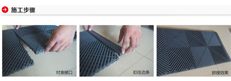 多功能拼接格柵具有高強(qiáng)承載、防水防油、色彩絢麗、施工簡(jiǎn)便、防水防污、無(wú)臭無(wú)毒等諸多優(yōu)點(diǎn),廣泛應(yīng)用于家庭陽(yáng)臺(tái)、汽車(chē)美容快修店、汽車(chē)4S店、洗浴中心、公共衛(wèi)生間、展覽展會(huì)、賓館酒店過(guò)道等場(chǎng)所。