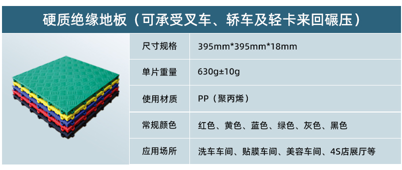 針對(duì)汽車(chē)快修車(chē)間、美容養(yǎng)護(hù)車(chē)間、汽車(chē)維修廠等區(qū)域,正和硬質(zhì)絕緣地板成為地面升級(jí)的全新選擇。正和硬質(zhì)絕緣地板下方密布數(shù)百個(gè)支撐點(diǎn),完全可以承受車(chē)輛的來(lái)回碾壓,具有安裝快速簡(jiǎn)便、對(duì)基礎(chǔ)要求寬泛、容易清理等特點(diǎn) ,特別適用于車(chē)庫(kù)地面鋪設(shè)使用,也可作為產(chǎn)品展示的臨時(shí)展臺(tái)使用。 正和硬質(zhì)絕緣地板采用100%純新PP材料生產(chǎn)而成,無(wú)毒、無(wú)味、環(huán)保,可回收利用,也可以用于健身房、辦公室等商用領(lǐng)域地面使用。