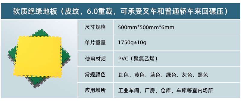 6、色彩絢,易搭配: 軟質(zhì)絕緣地板常規(guī)顏色為紅色、黃色、黑色、灰色、藍(lán)色、綠色等顏色,也可根據(jù)客戶的要求進行色彩的調(diào)整。正方形結(jié)構(gòu)讓施工搭配非常簡單。