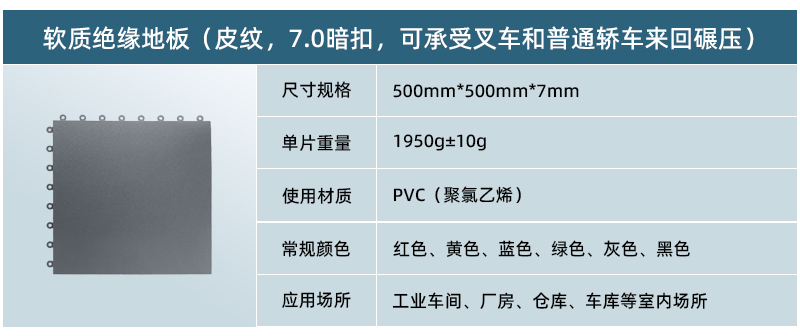 5、高承載,更防滑: 軟質(zhì)絕緣地板為實(shí)心結(jié)構(gòu),只要地面承重沒有問(wèn)題,其承載能力能夠達(dá)到每平米10噸以上。地板表面在生產(chǎn)過(guò)程中帶有凸起的紋路,讓車間地面更為防滑。
