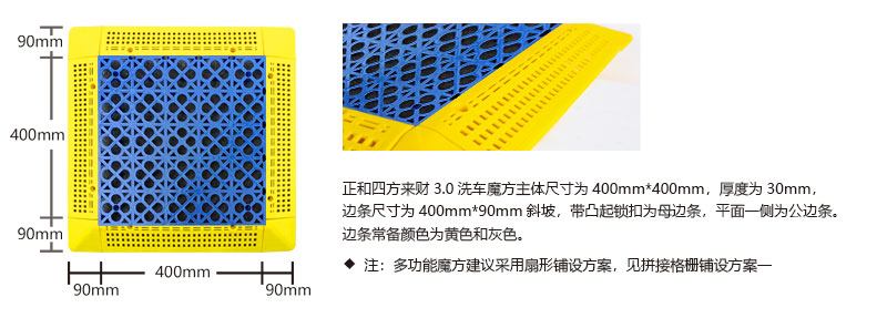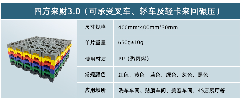 1. 分為3.4.5.厚度,解決不同厚度,統(tǒng)一紋路的問題 2. 啞光平紋設計,防滑,美觀,易清潔 3. 選用高級原料,加入其他輔料,顏色亮麗,無異味,無污染 4. 顏色為紅黃藍綠黑灰六色,滿足客戶用色需求,搭配屬于自己的風格 5. 通扣鎖扣設計,容易鋪設且容易拆卸打理 6. 加強支撐,不容易出現(xiàn)壓壞壓斷現(xiàn)象,滿足大多數車輛施工的要求 7. 使用年限長,五年超長質保,使用無后顧之憂 8. 十字支撐,保證承載最大化的同時,且易排泥排水